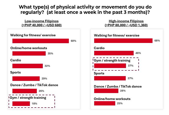 Recent consumer research reinforces this opportunity. In a proprietary quantitative study we conducted with 600 Filipino consumers, only 12% of low-income Filipinos (monthly household income below PHP 40,000 or ~USD 680) currently pay for gym memberships, compared to ~30% of high-income respondents (above PHP 80,000 or ~USD 1,360) [3].